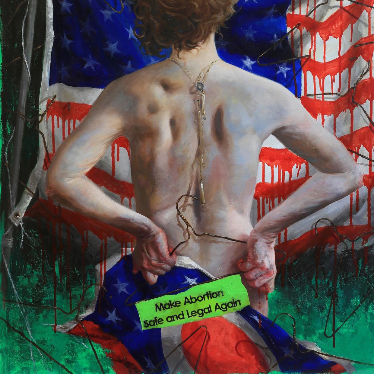 Judy Takacs piece, MASALA (Make Abortion Safe and Legal Again), is a perfect example of Judy being an artist in her own time. This is a dynamic issue in our society, and it took an enormous amount of bravery for Mrs. Takacs to create it and exhibit it in this exhibition. It is a painting that individuals on both sides of the issue should see and appreciate. When I was teaching high school art, I told my students that they should create art that viewers will either love or hate. The kind of art that is not actually art at all, is art that elicits no response and has no soul. This painting has soul. You will either love it or hate it, but you will not be oblivious to its presence. Judy Takacs has created a painting that explodes on the wall and demands your attention. It is thought provocative, and we all will be voting on it this election. Picasso said, “No, painting is not done to decorate apartments. It’s an instrument of war for attack and defense against the enemy.”