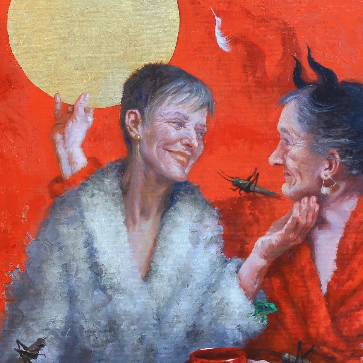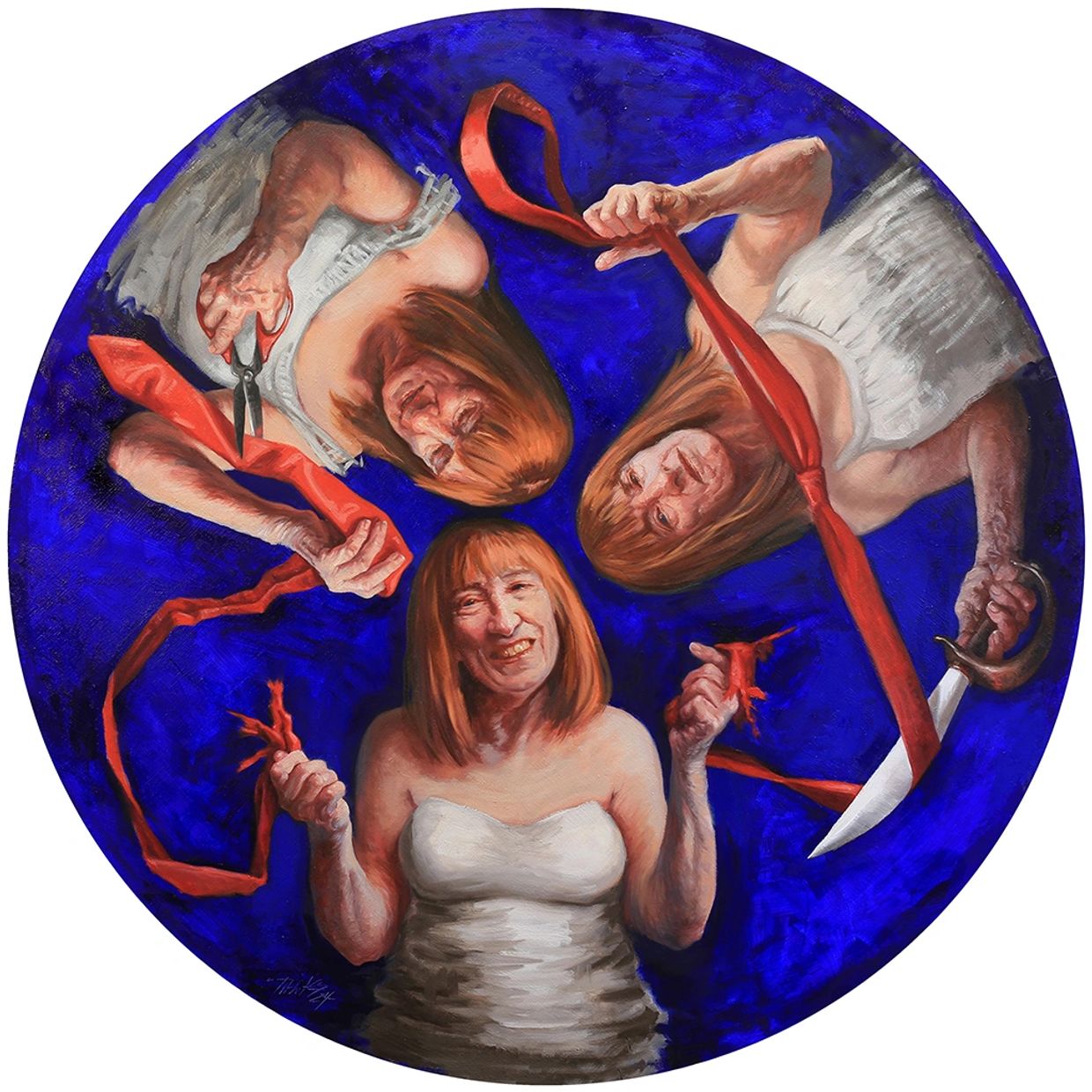 I’m psyched that my faintly veiled and politically charged painting has an audience…and an award… here at the Summit Artspace, right through the election season. The Three fates from Mythology control life, death and destiny for humans via a single thread spun from their spindle. When the thread is cut, the mortal’s life ends. My fates are wrestling with the iconic long red necktie and do not wish harm upon anyone. They, along with the artist, do however, emphatically believe that we as a nation must cut ties with those who promise to trample on human rights and overthrow democracy.